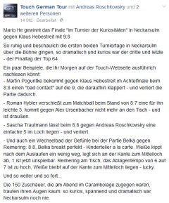 „Rund dreißig Leute können das Turnier gewinnen“, sagte Trautmann später im Interview mit dem Youtube-Kanal von Bluewhiteball, der unter der Regie von Bernd Schmotz knapp zwei Dutzend Partien aufzeichnete und der Öffentlichkeit zum Anschauen zur Verfügung stellt. „Diese Zahl ist immens. Zu meiner Hochzeit vor zehn bis fünfzehn Jahren waren es vielleicht fünf Leute, die solch ein Turnier gewinnen können“, führte Trautmann weiter aus.