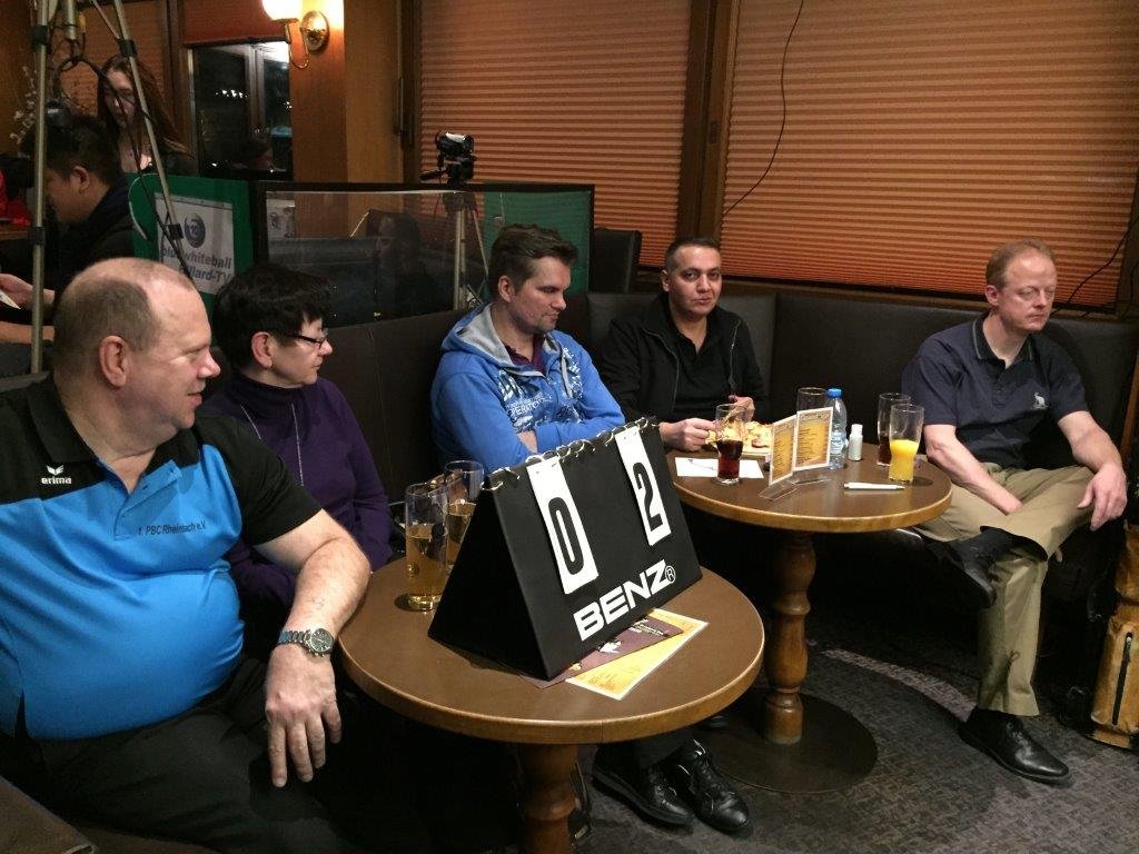 Fast hätte es für Hebestreit sogar zum ganz großen Triumph gereicht, denn im Finale gegen Mario He war er zunächst immer eine Nasenlänge voraus. Erst gegen Ende des Satzes wendete sich das Blatt. Die Spannung war nun greifbar, die rund 120 Zuschauer sahen wie gebannt zu. Vor den Mikrofonen von Bluewhiteball tümmelten sich gleich vier Kommentatoren und fachsimpelten, dass man bei 8:8 ja ganz selten eine An-Aus-Partie sähe und dass das Hill-Hill-Match sicherlich in einem Safeduell gipfeln würde.