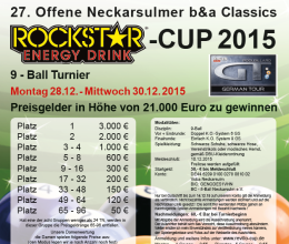 Roman Hybler gewinnt das German Tour Finale 2015. Herzlichen Glückwunsch auch an den zweiten Nick van den Berg, den beiden dritten Francisco Bustamante und dem Neckarsulmer b& a Classics Gewinner 2015 Can Salim. Herzlichen Glückwunsch an die Siegerin des Damenturniers Ina Kaplan, sowie der zweiten Jenny Vietz, und den dritten Yini Gaspar und der Gewinnerin des Damenfeldes in Neckarsulm Kristina Grim.