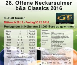 Das traditionnellste und in Deutschland renomierteste Turnier lud alle Topspieler vom 28.-30.12.2016 ins Carambolage nach Neckarsulm ein. Der Einladung von Peter Flicker folgten viele Billardgrössen, wie Ralf Souquet, Oliver Ortmann, Joshua Filler, Roman Hybler und Sniegocki Mateusz aus Polen.