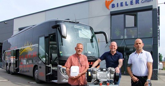 Wer glaubt, die Desinfektion eines Raumes oder Fahrzeugs sei mühsam und zeitintensiv täuscht sich. Die Bieler Drucklufttechnik GmbH, Wasserform GmbH und Glanzwerk GmbH haben Raumdesinfektion auf Knopfdruck möglich gemacht. Die drei kooperierenden Unternehmen zeigen die Raumdesinfektion durch 3D-Vernebelung anhand eines Reisebusses: Dazu wird ein mobiles Kaltvernebelungsgerät zentral im Bus positioniert. Durch einen angeschlossenen Kompressor wird nun per Knopfdruck aus mehreren Edelstahldüsen das Desinfektionsmittel ASANTO® air gleichmäßig im Raum verteilt. Das spezielle Vernebelungsgerät erzeugt einen schwebefähigen Nebel aus Desinfektionsmittel, der lange in der Luft schwebt und nur langsam zu Boden sinkt. So erreichen die feinen Tröpfchen selbst unzugängliche Stellen sowie die gesamte Raumluft und befreien diese von Bakterien, Viren, Pilzen und unerwünschten Gerüchen. Mit Druckluft, dem mobilen Kaltvernebelungsgerät inklusive Edelstahldüsen und dem Desinfektionsmittel ASANTO® air schaffen die drei Unternehmen ein Komplettpaket zur komfortablen und effektiven Desinfektion von Räumen und Fahrzeuginnenräumen. An das mobile Kaltvernebelungsgerät der Glanzwerk GmbH können bis zu sechs Edelstahldüsen angeschlossen und im gewünschten Winkel positioniert werden. Durch den angeschlossenen Kompressor der Bieler Drucklufttechnik GmbH – erhältlich in vier verschiedenen Größen, je nach Anzahl der angeschlossenen Düsen – versprühen die Vernebelungsgeräte den Wirkstoff mit einem Druck von 2,5 bis 3 bar. Die Geräte gibt es in einer Basisausführung und in einer Ausführung aus Edelstahl. Letztere dürfen auch in gastronomischen oder sensiblen Bereichen eingesetzt werden.